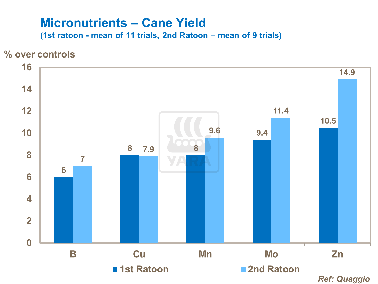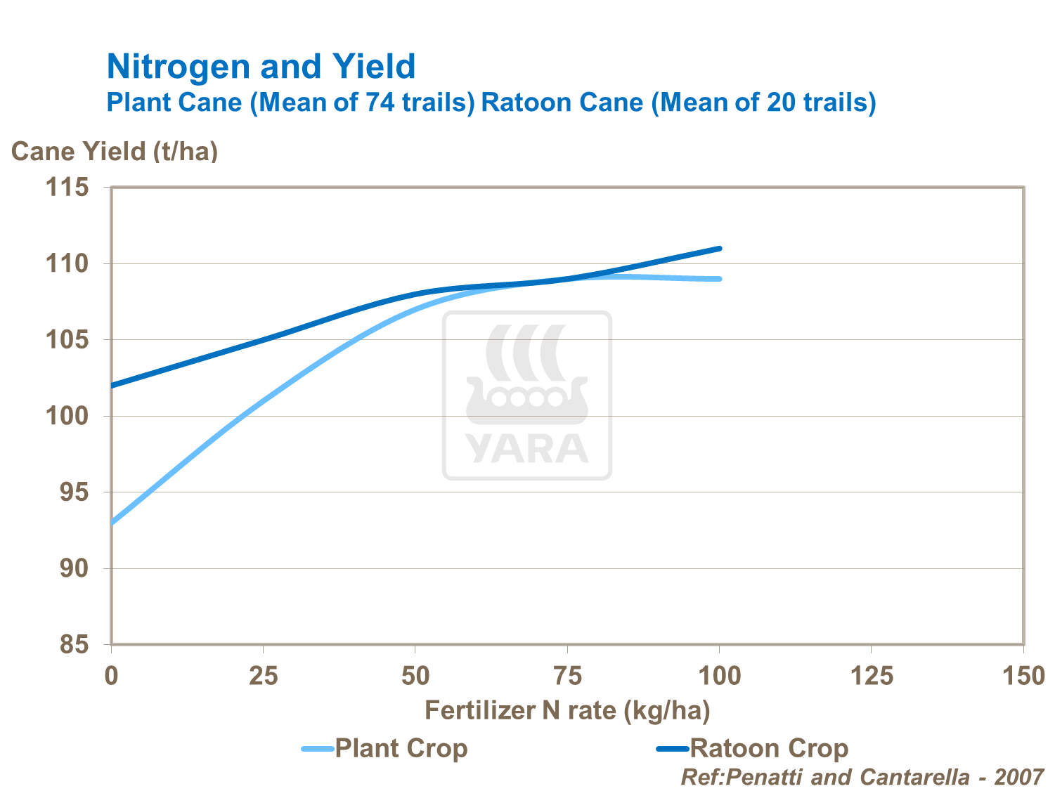 Nitrogen is important for high cane yields. Nitrogen is needed in large quantities and helps to maximize DM (dry matter) production and yield. Nitrogen is one of the main building blocks of proteins and essential for photosynthesis and sugar production. Plant crops usually benefit from freshly mineralized supplies of nitrogen from the cultivated soil. However, fertilizer N also helps increase yields in the higher yielding plant crop. Yield responses are also seen in ratoon crops which also respond to N supply.